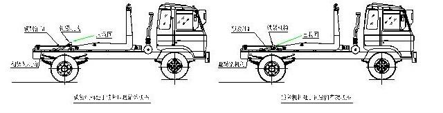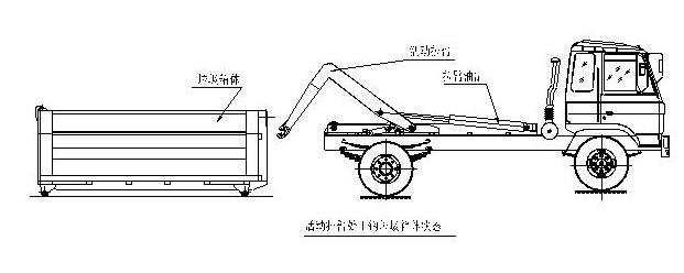 拉臂式垃圾車(車廂可卸式垃圾車)使用說明 一、概述 什么是勾臂垃圾車? 車廂可卸式垃圾車又稱拉臂式垃圾車(以下簡稱垃圾車)是用于城鎮(zhèn)袋裝、散裝生活垃圾物的收集、運(yùn)輸、卸料作業(yè)的專用車輛。 該車是由汽車底盤、拉臂主油缸、附車架、翻轉(zhuǎn)架、支撐腿(選裝)、鎖緊架、鎖緊油缸及多路換向閥等組成。翻轉(zhuǎn)架一端連在附車架上,其另一端設(shè)有活動拉臂,中間安裝有鎖緊系統(tǒng);活動臂油缸一端連在活動臂上,另一端連接在附車架上;鎖緊機(jī)構(gòu)通過鎖緊油缸的動作可以在箱體自卸時(shí)將附車架上的箱體與翻轉(zhuǎn)架及拉臂連為一體,在主油缸伸出時(shí)形成自卸角,也可以通過鎖緊油缸的收回把翻轉(zhuǎn)架與附車架鎖緊為一體,利用主油缸的收回或伸出使活動拉臂將地下的垃圾箱拖拉至附車架上或從附車架上放回到地面。 該車可將地下垃圾箱內(nèi)的垃圾及垃圾箱一同拉至車上運(yùn)走同時(shí)可自卸,降低了工人的勞動強(qiáng)度。該垃圾車的收運(yùn)方式是目前世界上廣泛采用的垃圾收運(yùn)方式,可以實(shí)現(xiàn)一車多箱,大大降低了配備成本和空間等等;其專用裝置的功能均以汽車發(fā)動機(jī)為動力,通過液壓機(jī)構(gòu)手動或電控來實(shí)現(xiàn)。車輛的箱體采用優(yōu)質(zhì)炭鋼板全密封焊接結(jié)構(gòu),具有強(qiáng)度高、重量輕、不產(chǎn)生二次污染等優(yōu)點(diǎn)。 二、結(jié)構(gòu)簡圖 三、操作步驟 在裝載垃圾前,空載運(yùn)轉(zhuǎn)達(dá)到6個(gè)標(biāo)準(zhǔn)氣壓時(shí),掛上取力器(駕駛室內(nèi)方向盤左下方),檢查各部件有無泄漏或異常后,再按照操作指示牌指示位置進(jìn)行操作;其具體操作步驟如下: 拉起垃圾箱體 步驟1.將鎖緊鉤操作手柄推至收回位置,鎖緊油缸收回,使鎖緊架收回并將翻轉(zhuǎn)架與附車架鎖緊固定;如圖: 步驟2.將拉臂操作手柄拉起到伸起位置,拉臂油缸伸出,活動拉臂繞翻轉(zhuǎn)翻轉(zhuǎn)架前鉸鏈軸旋轉(zhuǎn),拉臂處于鉤箱位置,適當(dāng)調(diào)整拉臂鉤高度并與箱體彎鉤對準(zhǔn);如圖: