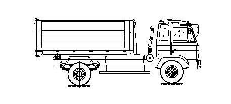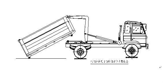 步驟3.當(dāng)拉臂鉤鉤到箱體彎鉤時(shí),繼續(xù)推下拉臂操作手柄到落下位置,使垃圾箱體繼續(xù)上車(注意:保證垃圾箱體的縱梁位于附車架尾部兩后滾輪之間);如圖: