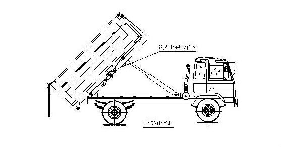 完成垃圾箱體的上車工作,松開取力器,整車可以運(yùn)輸行駛。 步驟5. 在卸垃圾前,整車運(yùn)轉(zhuǎn)達(dá)到6個(gè)標(biāo)準(zhǔn)氣壓時(shí)掛上取力器,打開垃圾箱后門鎖緊裝置,在前級二聯(lián)多路閥處,首先確定鎖緊架鎖緊垃圾箱體(拉起鎖緊鉤操作手柄至鎖緊位置),然后拉起拉臂操作手柄至伸出位置,垃圾箱體備傾斜舉起垃圾卸出;如圖: