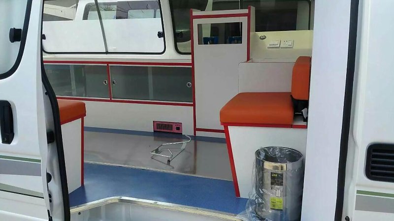 1、便攜折疊式擔架1件;2、醫(yī)藥柜1件;3、固定安裝氧氣瓶1只;4、輸液吊鉤2只;5、消毒燈1只;6、污物桶1只;7、單人座椅3只;8、長條貯藏柜帶2人位軟座墊、軟靠背和安全帶1套;9、中隔斷帶鋁合金滑窗1套;10、前頂裝全藍警燈警報器1套;11、照明燈2只;12、逆變器1只;13、電源插座1組;14、中門上車扶手;15、后門上車踏板;16、醫(yī)用耐磨塑膠地板革;17、貼救護十字標志;廠家銷售熱線:13872882215.